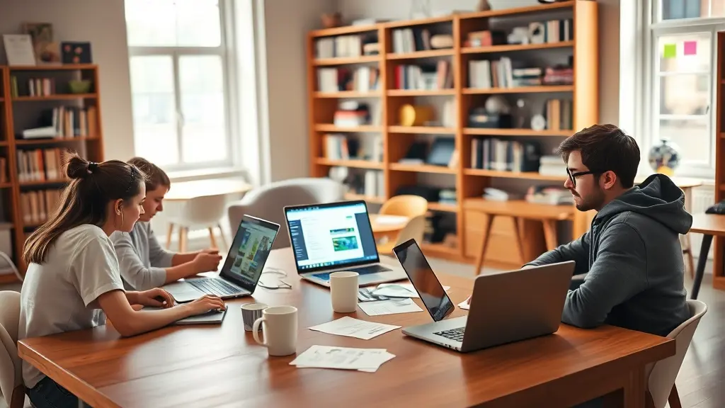 In a room filled with natural light, a group of young people is sitting around a wide wooden desk. Each of them is engrossed in their own laptop, their screens glowing with text, numbers, and colorful graphics. The atmosphere reflects focus and dedication to work or study. One of them is wearing a simple white shirt with jeans, while another has chosen a grey hoodie and glasses, giving him a serious look. On the desk, there are coffee cups and scattered papers, adding a touch of creative chaos. In the background, shelves filled with books and office supplies suggest they are in a shared workspace or library. The warm lighting and quiet ambiance
