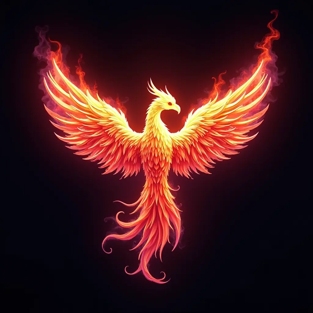 شعار طائر الفينيق، يتصاعد من النيران الرقمية، مستقبلي، تفصيلي، ألوان نيون، ثلاثي الأبعاد ومكتوب عليه POV