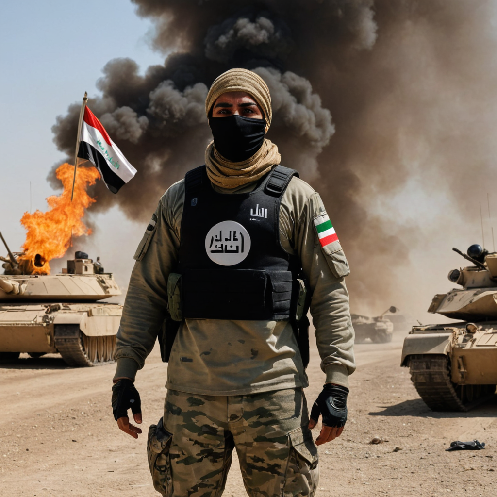 جندي ملثم مع علم العراق يقف امام دبابات و يلبس ملابس لونها زيتوني و شعار العراق بها في مكان فيه دبابات محترقة و جثث اعداء