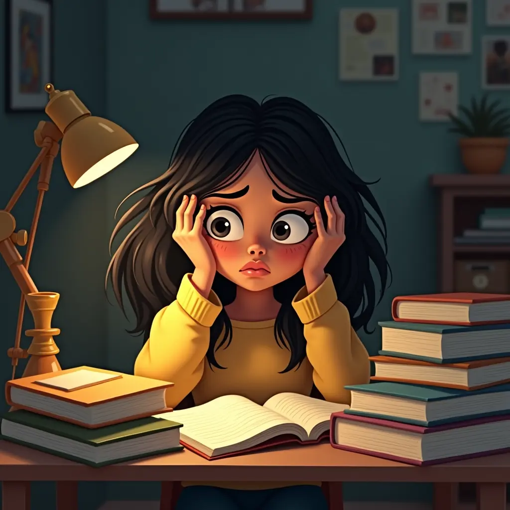 اعمل بنت بتذاكر مواد كتير وتعبت و محتاره ومش عارفه تذاكر وطتب كتير لازم تذاكرها وكتب مرميه وعلي مكتب صغير وتكون الاضاءه غامقه شويه زي اللون العسلي والبنت تكون ملامح مصريه وتالته اعدادي