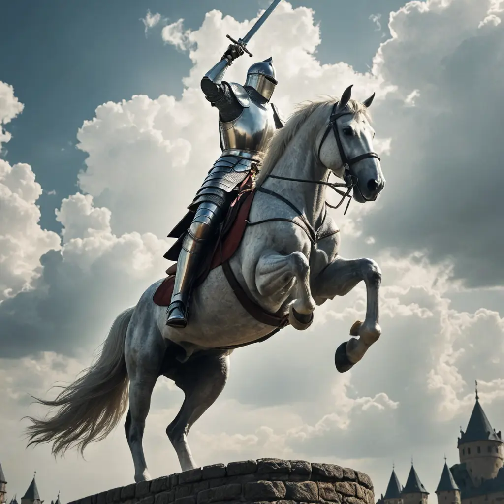 فارس طويل يركب الحصان وبيده سيف ضخم والحصان شاهق لسماء
