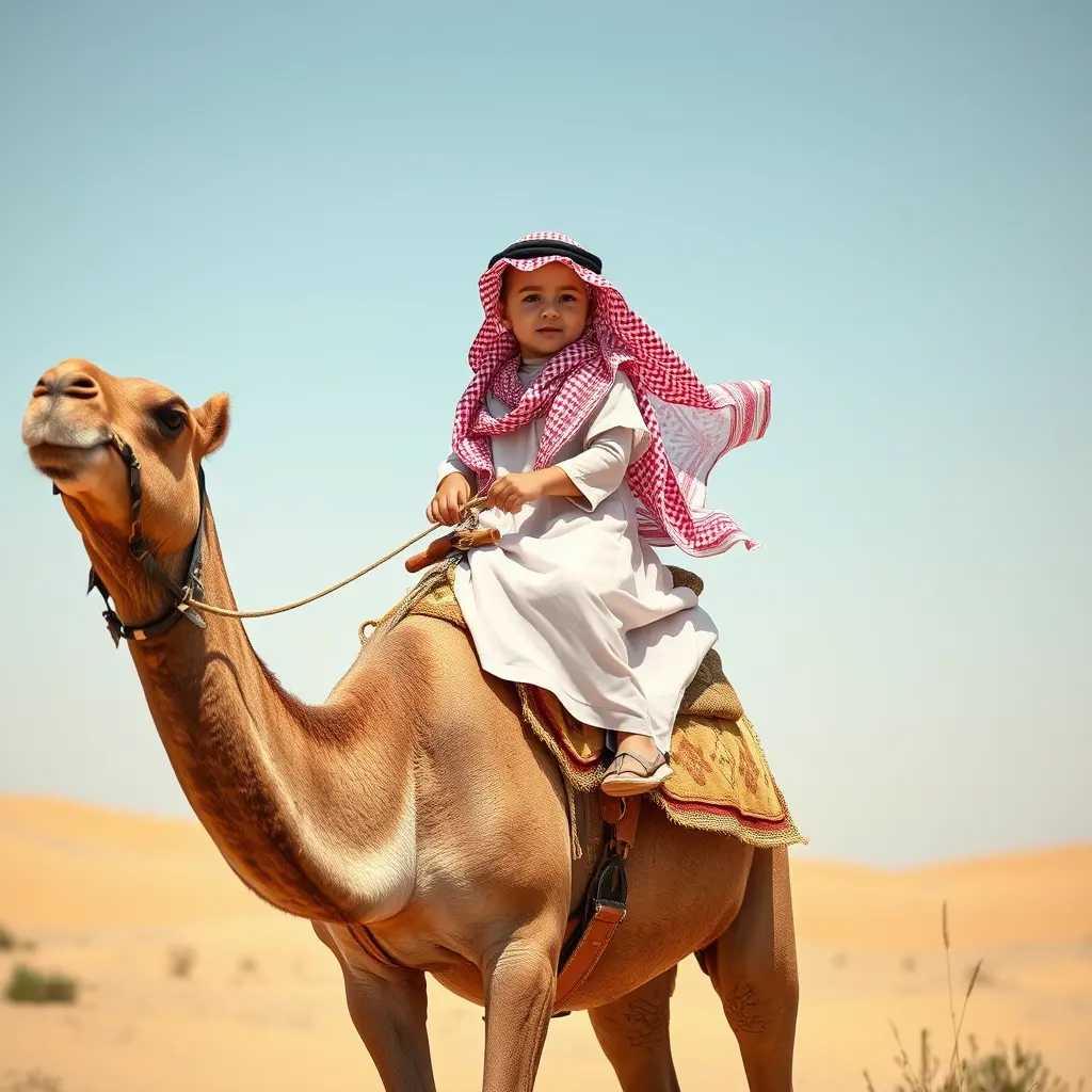 طفل جميل بلباس سعودي راكب فوق جمل سنام واحد في صحراء يوجد بها اعشاب