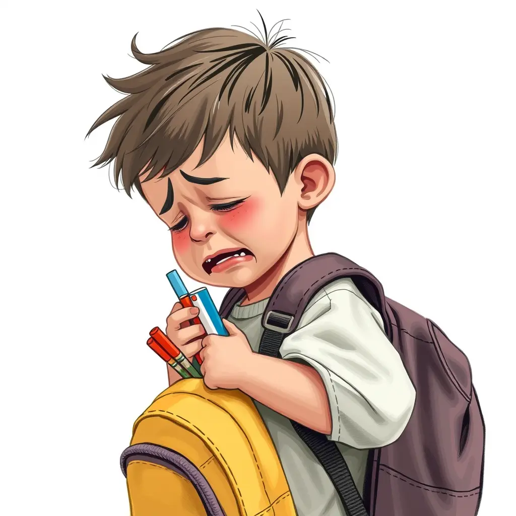 طفل يحمل شنطة المدرسة يبكي لانه فقد ادواته