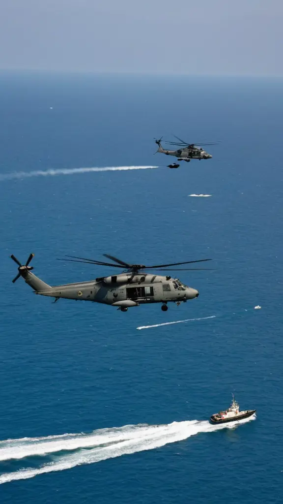 عشرات من طائرات الهليكوبتر العسكرية الضخمه تحلق فوق البحر بشكل بارز