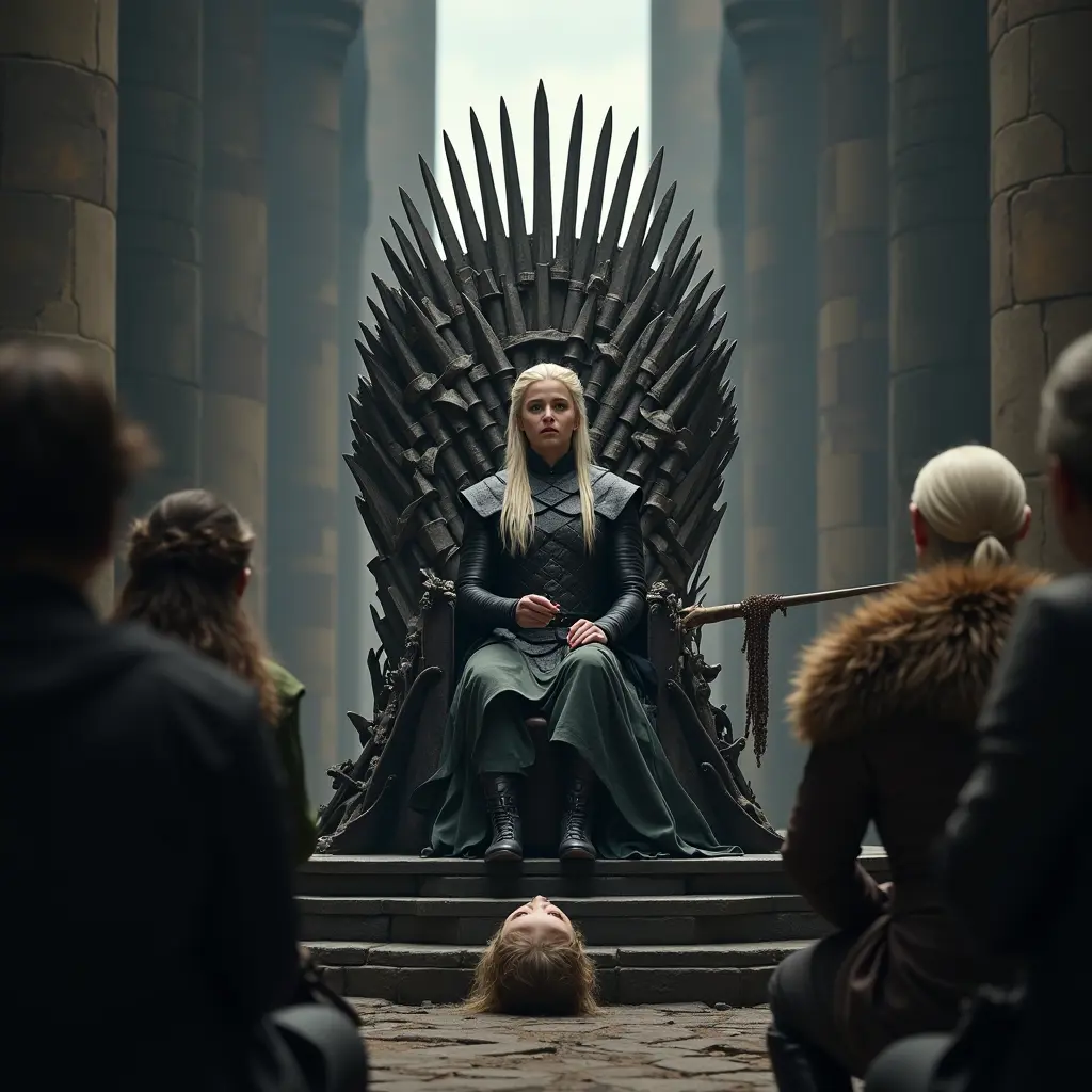 دينيريس تارغيريان تجلس على العرش الحديدي ويركع لها كل العائلات ويستروس ورأس جون سنو معلق على رمح  وكذلك تيريون لانيستر بمشهد سينمائي رهيب وجودة صورة عالية