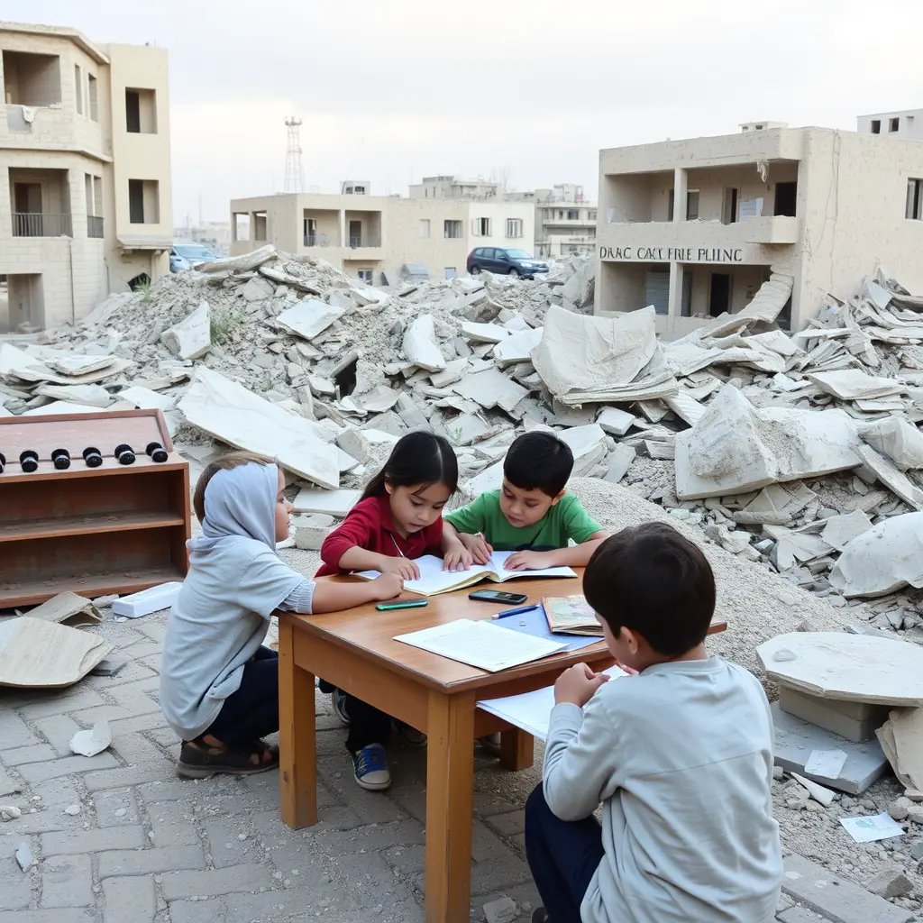 اطفال يدرسون بين القصف و الدمار في فلسطين