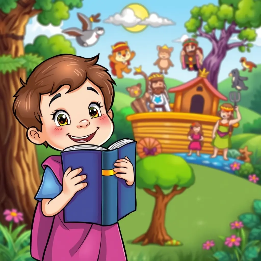 صورة كرتونية ملونة وجذابة للأطفال تمثل طفلًا يمسك كتابًا. خلف الطفل، تظهر عناصر مختلفة من قصص الكتاب المقدس مثل فلك نوح، داود وجليات، شجرة آدم وحواء، وغيرها. يجب أن تكون الألوان زاهية والشخصيات مرحة ومحببة للأطفال، مع خلفية طبيعية مليئة بالألوان والحياة.