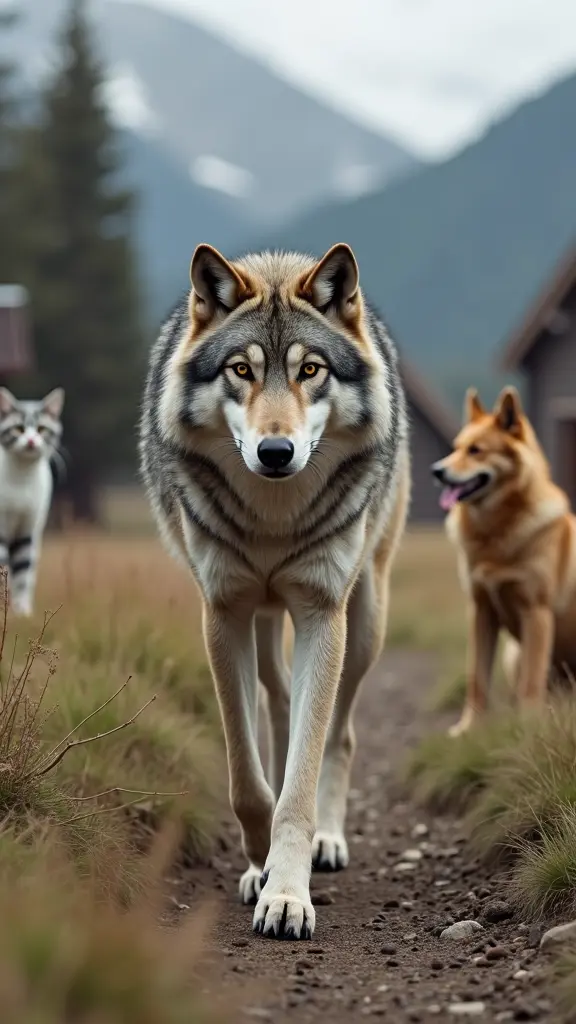 يمشي الذئب الرمادي وحيدًا وسط البرية، رأسه مرفوع وخطواته واثقة، تحيط به مساحات مفتوحة لا يقيّده فيها أحد. في الخلفية، يظهر الكلب البني والقط الأبيض الرمادي جالسين بالقرب من بيوتٍ بشرية، يراقبانه بصمت من بعيد. مشهد يُجسّد التباين بين حرية الوحش وعلاقة الأُلفة التي تربط الآخرين بالإنسان.