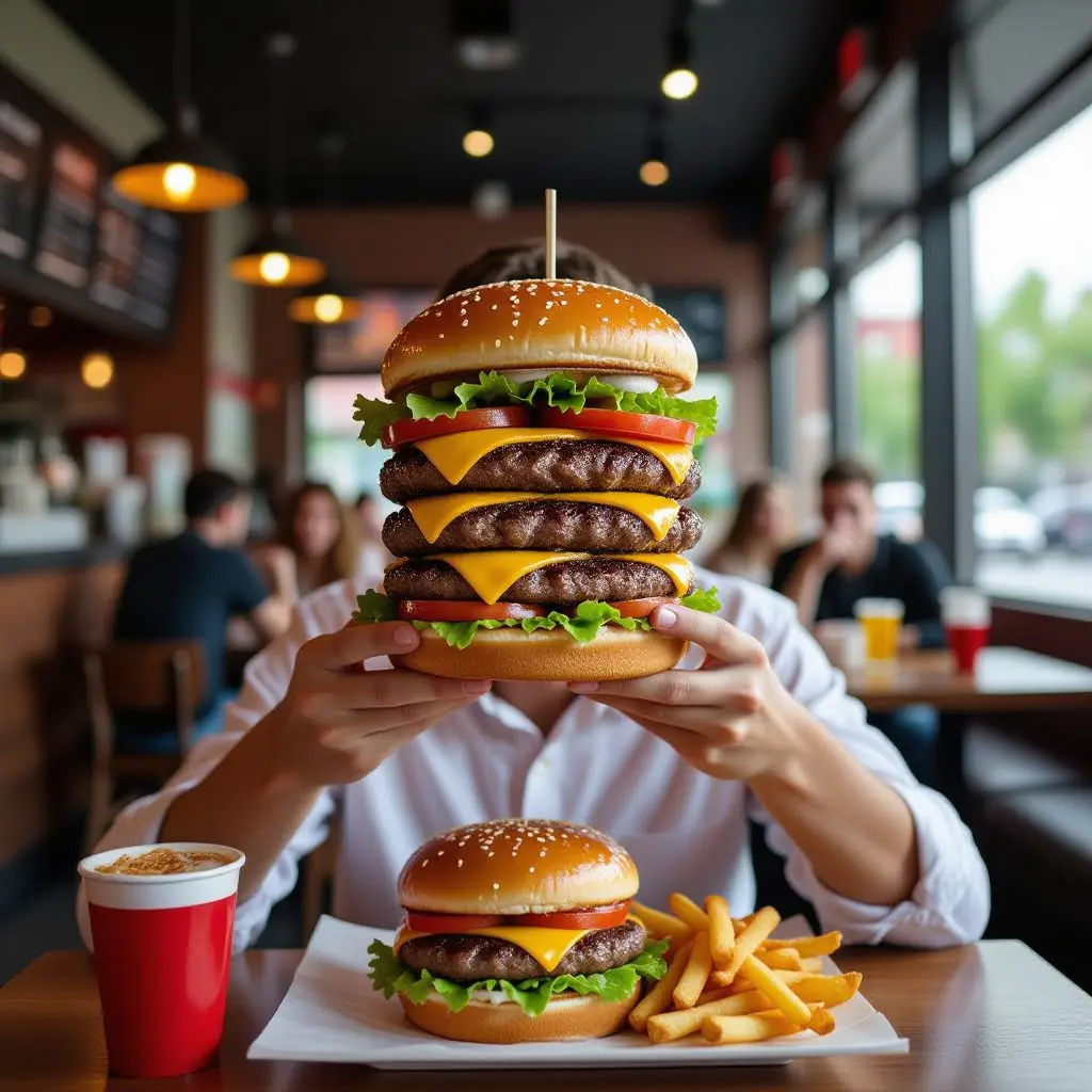 شخص ياكل في مطعم برجر و هو مصنوع من البرجر