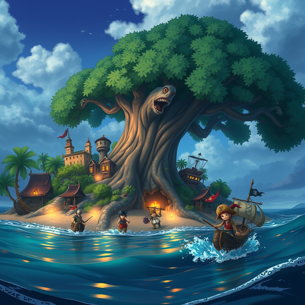 جزيرة يوجد فيها شجرة عملاقة وبعض المباني والاضائة يحيط بها  قراصنة متطورون تحاول الدخول للجزيرة والي جانبهم طاقم قبعة القش