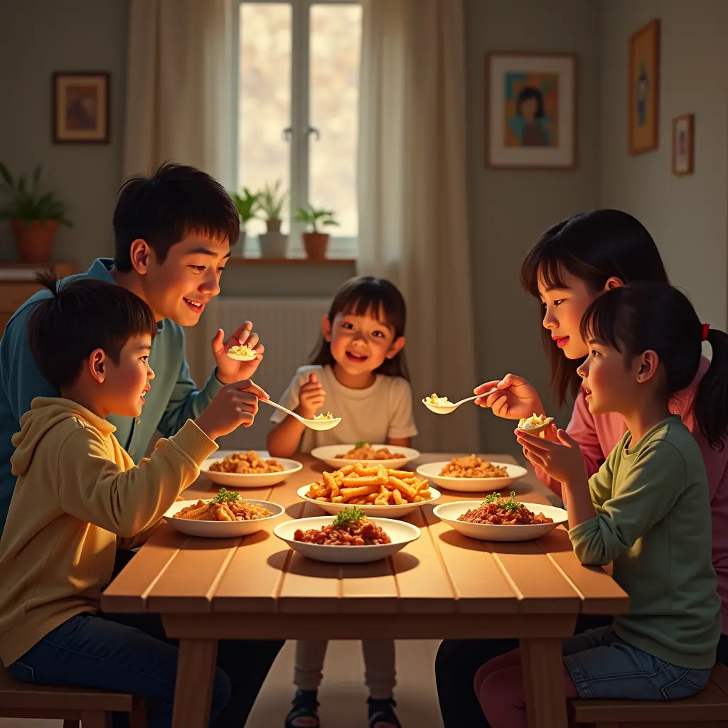 صور معبره عن عائله تأكل الطعام في منزل دافئ