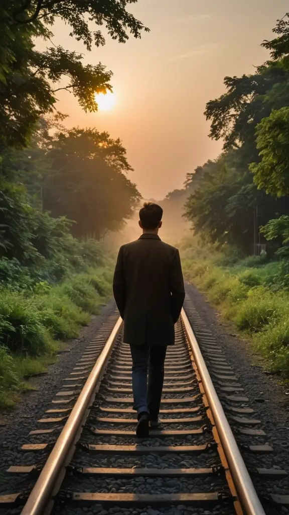 انشاء صورة رجل يمشي  على سكة الحديد القطار مع غروب الشمس  على  الأطراف السكة الحديدية توجد غبات خضراء كأنها مهجور قديم السماء تزين هديه المكان