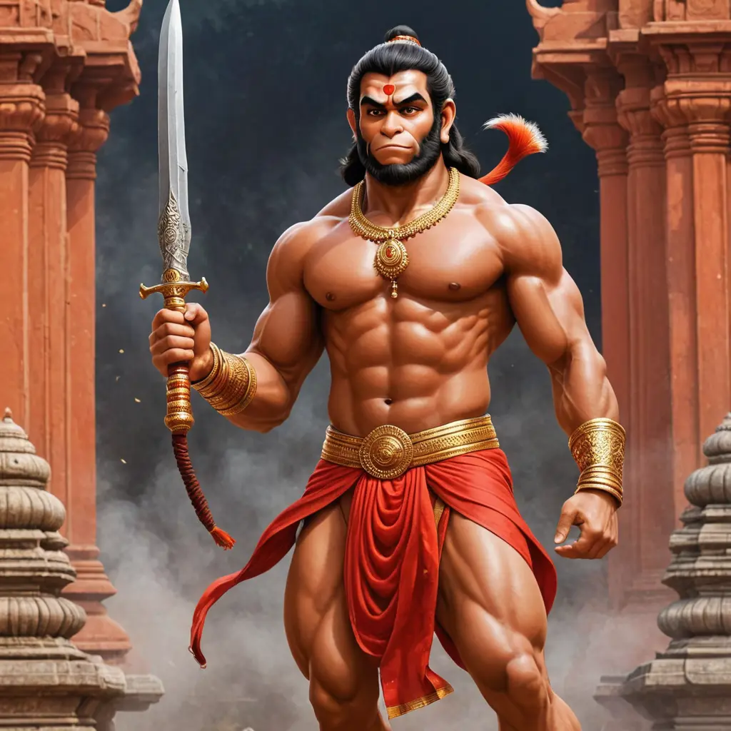 Create a g Hanuman Ji hd image with his powerful body in red kurta pajama holding his weapon in right hand and background must be ram Mandir