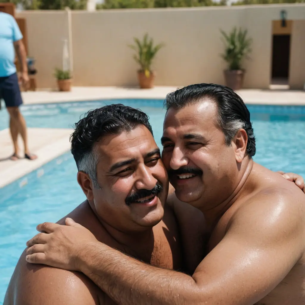 رجل سعودي خمسيني سمين ولديه حبه خال كبيره يسار فمه وشنب في شيب وشعر اسود مع رجل يحضنان بعض في مسبح