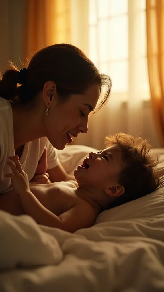 A mother comforting her crying child on a bed, soft golden window light behind them, warm shadows, emotional intimacy, realistic details, love and care in her eyes, cinematic color grading, 9:16 portrait
