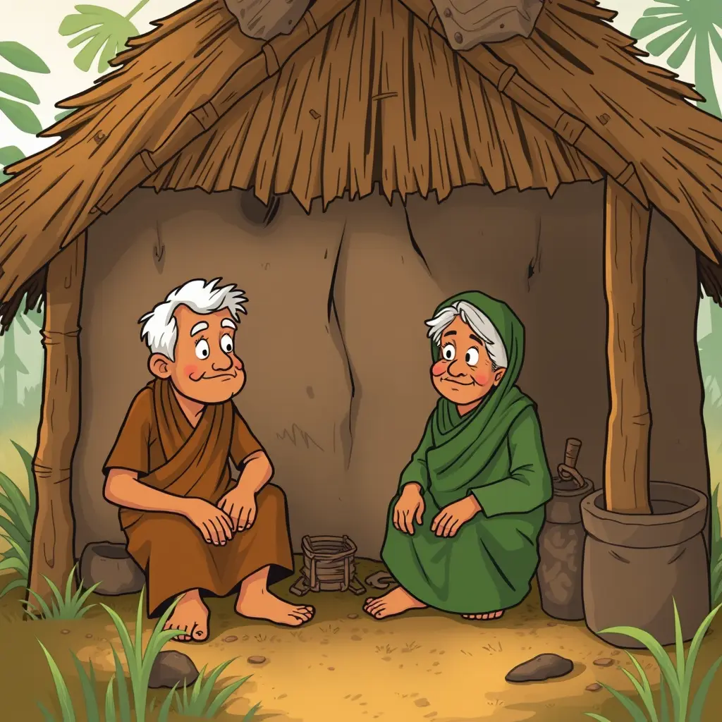 رجل يعيش مع والديه كبيرا السن كوخ في قرية فقيرة كرتون