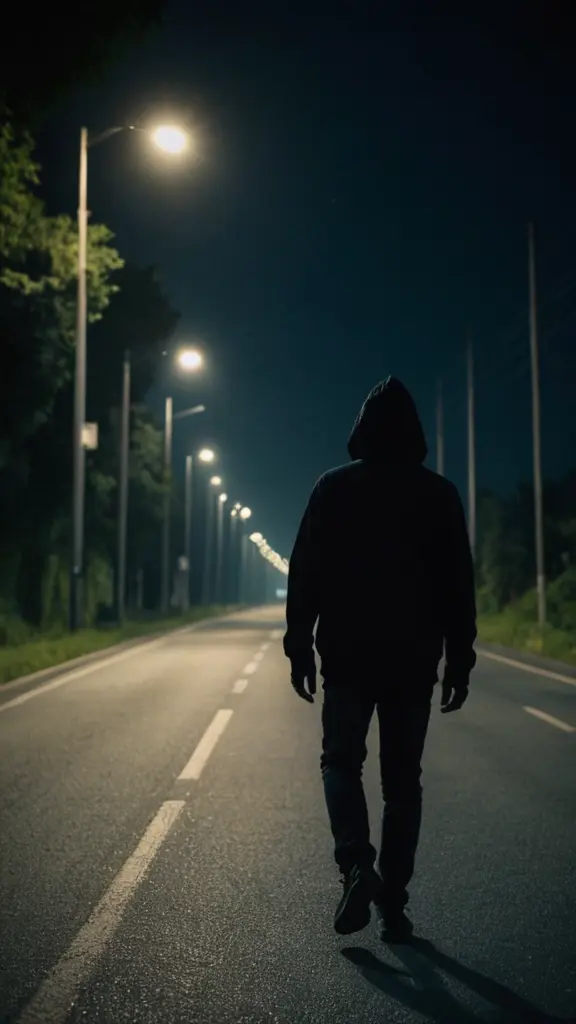 رجل يمشي في الطريق ليلا ولا يظهر وجهه وهو حزين والطريق مخيف ومظلم