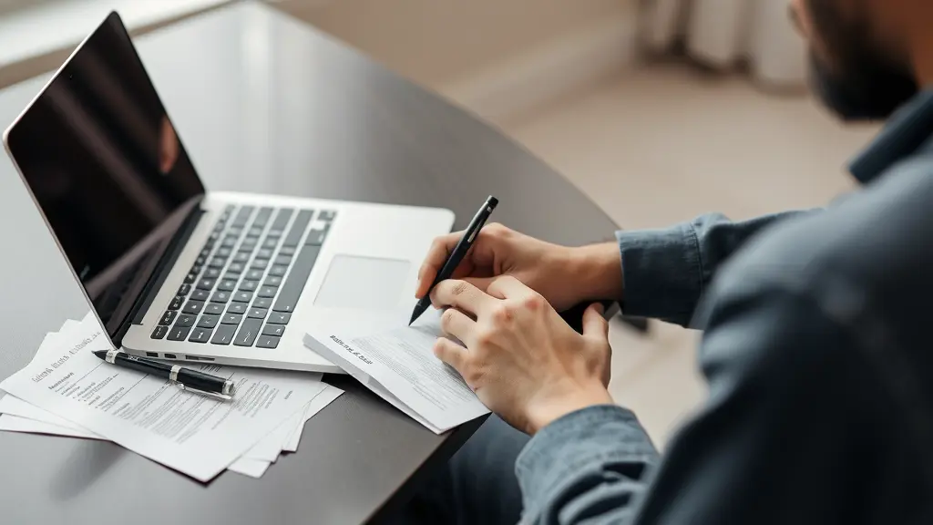 شخص يكتب علي لابتوب و بجانبه اوراق و قلم مع عدم ظهور الشخص نفسه