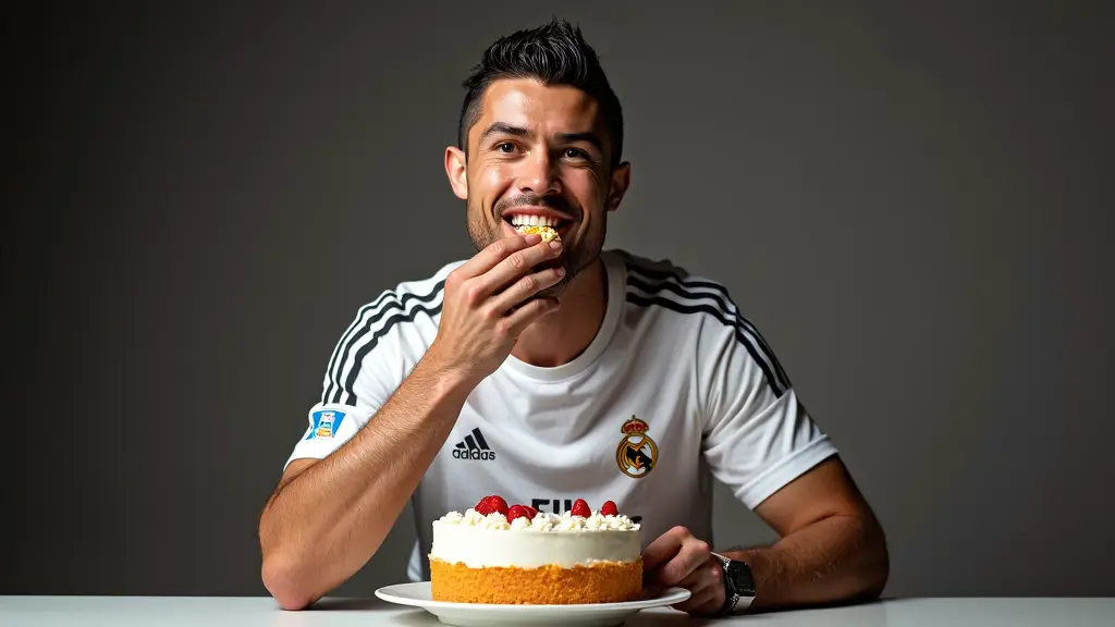 كريستيانو رونالدوا صورة عالية الدقة يلبس تيشرت ريال مدريد ويأكل كعكة عليها صورة برشلونة