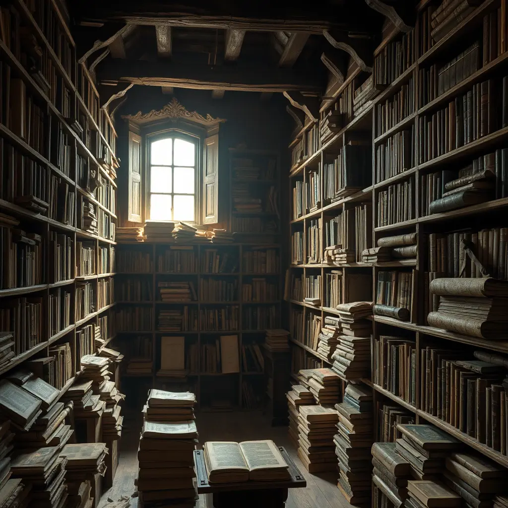 مكتبة قديمة مملوءة بالكتب القديمة واللفائف رفوف خشبية مملوءة بكتب مختلفة الأحجام، الضوء الخافت ينساب من نافذة صغيرة.