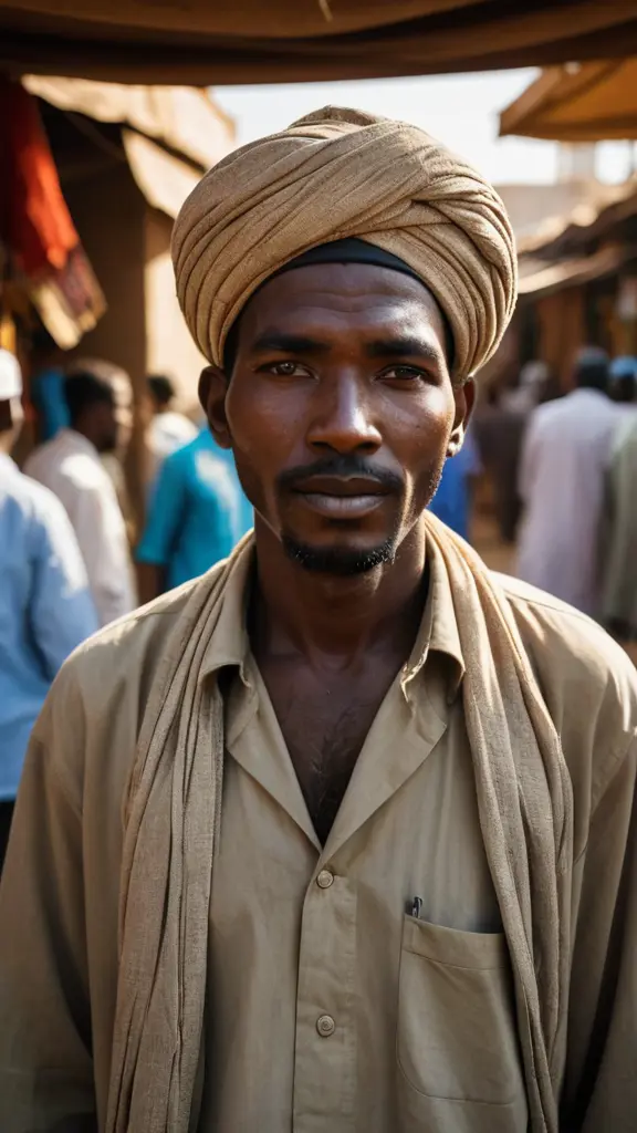 رجل سوداني يرتدي جلباب وعمامة يقف في سوق محلي مزدحم