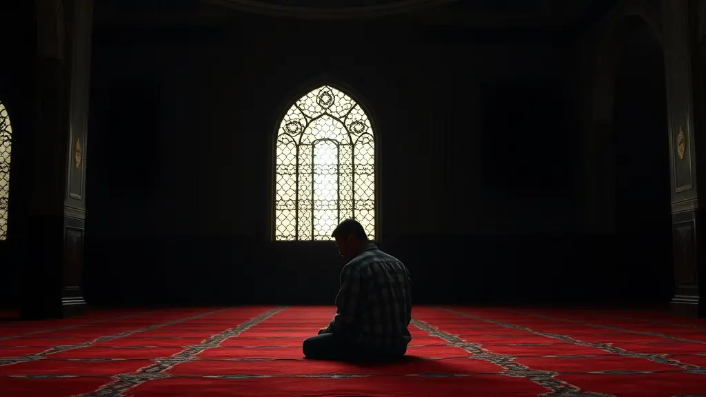 شخص بداخل مسجد يدعي وهو حزين وفيه خلفيه سوداء مع ارضيه سجاد المسجد بلونه الاحمر والشخص يجلس بالجنب مش في الوش