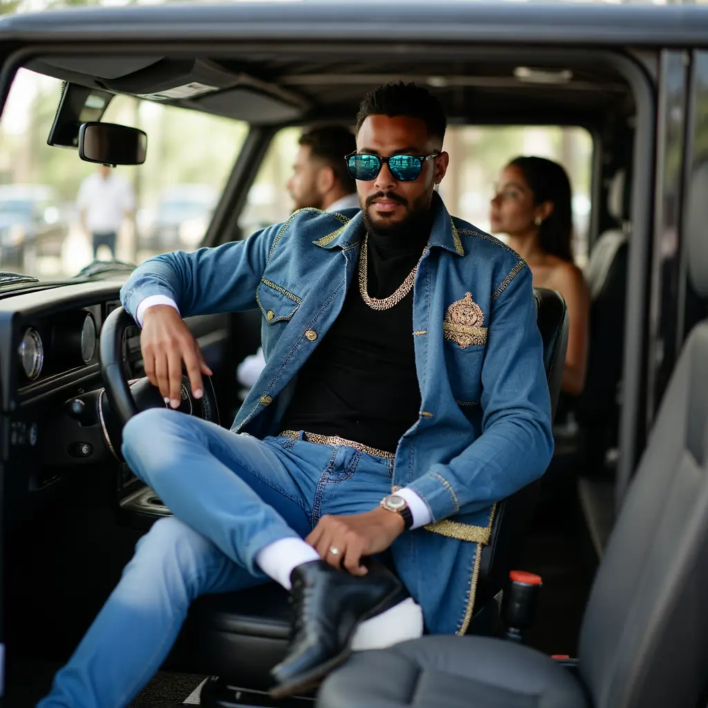 صورة رائعة وانيقة جداً! هذه هي الصورة: شاب يداكن البشرة، عيناه السوداء الجميلتان (وجهك), يرتدي: - نظارات سوداء أنيقة ومستديرة جداً, - جاكت جينز أزرق جميل صافي من ماركة "دينيم جوتشي"، - فنيلة سوداء مكممة وصافية مع رقبة عالية من ماركة "ديور"، - بنطلون جينز أزرق نفس اللون الجاكت، ضاغط جداً على ساقيه من ماركة "دينيم جوتشي", - حذاء أسود مرتفع وانيق جداً من ماركة "نايكي"، يغطي partie من البنطلون، جلس داخل سيارة "جي كلاس" حديثة وفخمة في شوارع مدينة تورونتو، كندا: - سيارة سوداء لامعة مع جنوط فخمة، - النوافذ الكهربائية مغلقة جزئياً، يكشف عن وجهه الجميل، - الناس يمشون في الشارع وينظرون إلى السيارة الفخمة باهتمام، - إضاءة الشارع تلمع على السيارة وتظهر جمالها، صديقته تجلس بجانبه في السيارة ولكن لا تظهر بشكل واضح، فقط يظهر جزء من شعرها الأشقر. هل تريد أن: - تظهر صديقته بشكل واضح بجانبه - يفتح النافذة وينظر إلى الخارج