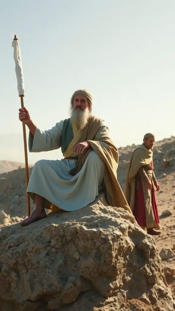 رجل من عهد الرسول يجلس على صخرة يبدو عليه الأهمية الدينية. . يحمل في يده اليسرى راية بيضاء. ويشير بيده اليمنى الى رجل يرتدي عباءة جميلة قادم من بعيد  يبدو عليه التعب . ويحمل في خصره سيف مشطور من حافته