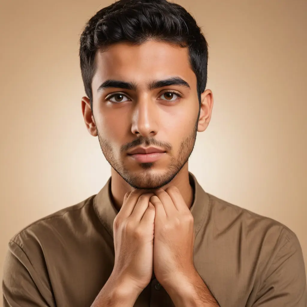 شاب عربي ذو ملامح تفكير وتساؤل، وجهه يعكس تعبيرًا من الحيرة والتفكير العميق، يديه موضوعتان على وجهه بطريقة تعكس القلق أو التساؤل. لديه شعر قصير ومظهر عصري، يرتدي ملابس بسيطة لكن أنيقة. خلفية ناعمة غير محددة لتركز الانتباه على تعبير وجهه. الألوان دافئة مع تدرجات خفيفة من البرتقالي والذهبي لإضافة عمق للتعبير البصري."