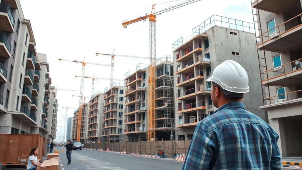 مباني قيد الانشاء يتوسطها شارع ويقف مهندس بخوذة بيضاء