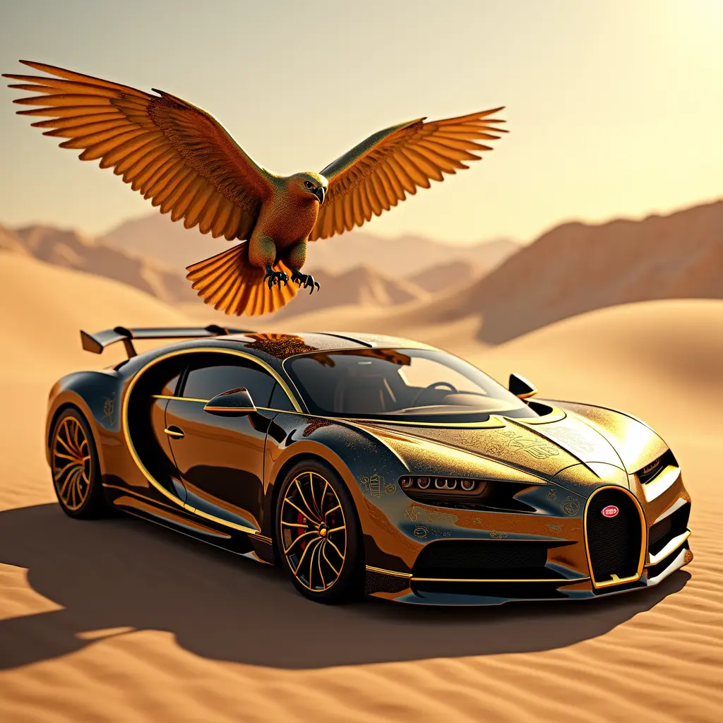 luxury car, Bugatti Chiron, gold and black, detailed, desert background, sand dunes, realistic CGI, high detail, golden eagle flying, two eagles, ancient Egyptian style, hieroglyphics on car, sunlight, realistic textures, shiny gold, sleek design, luxury vehicle, opulent, high-end, high contrast, digital art, hyper-realistic, majestic, elegant, exotic, grand, ornate, majestic, grandeur, ancient Egyptian theme, intricate details, majestic scene, luxury lifestyle