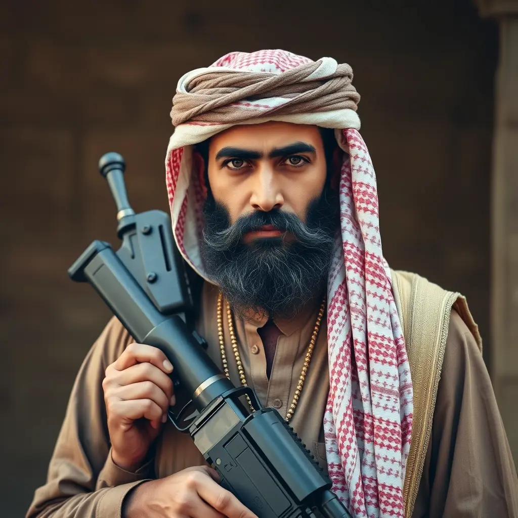 رجل يمني تهامي يلبس المعوز التهامي والمعجر والخناجر التهاميه ولديه لحيه وشارب ويحمل سلاح على كتفه آلي وطويل وجميل