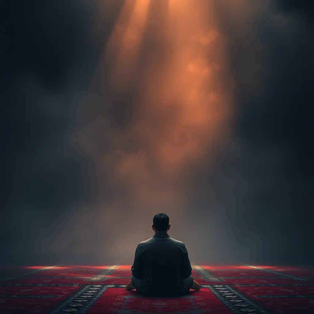 خلفية سنمائية مريج من اللون الاسود والضبابي  ونور منبثق من الاعلى الى الاسفل حيث يجلس رجل على سجاده حمراء يتلو قران.
