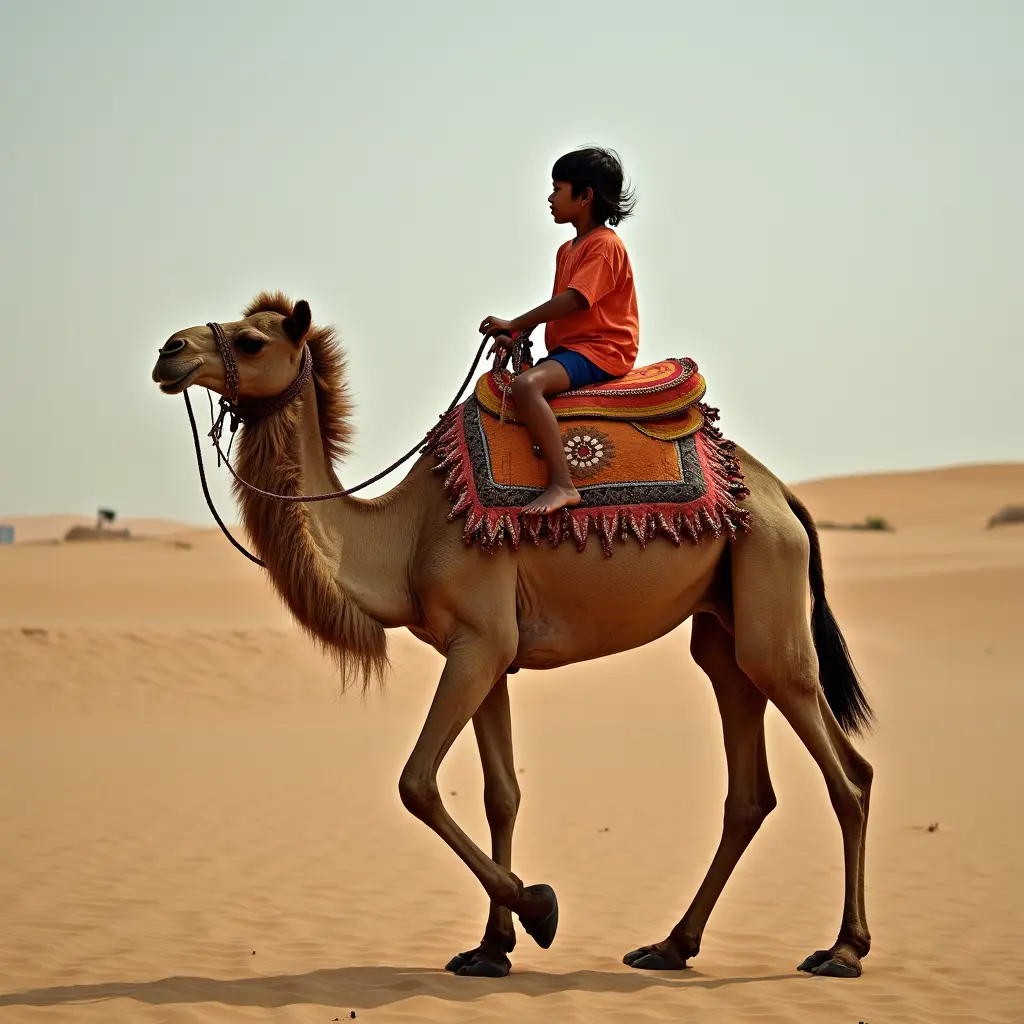 طفل يركب جمل خلف أمه