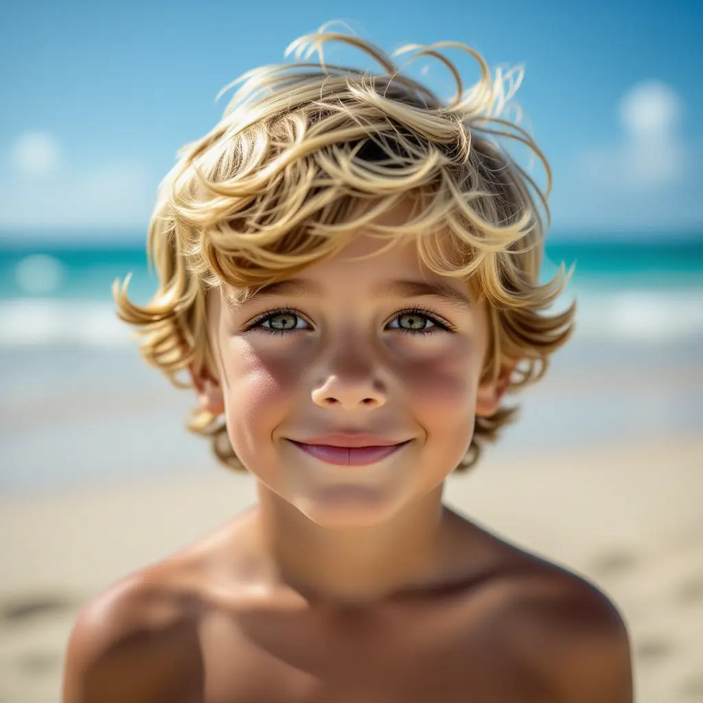 ولد أشقر يلبس ملابس سباحة محتشمة على الشاطئ، يتميز بغمازاته ورموشه الطويلة.