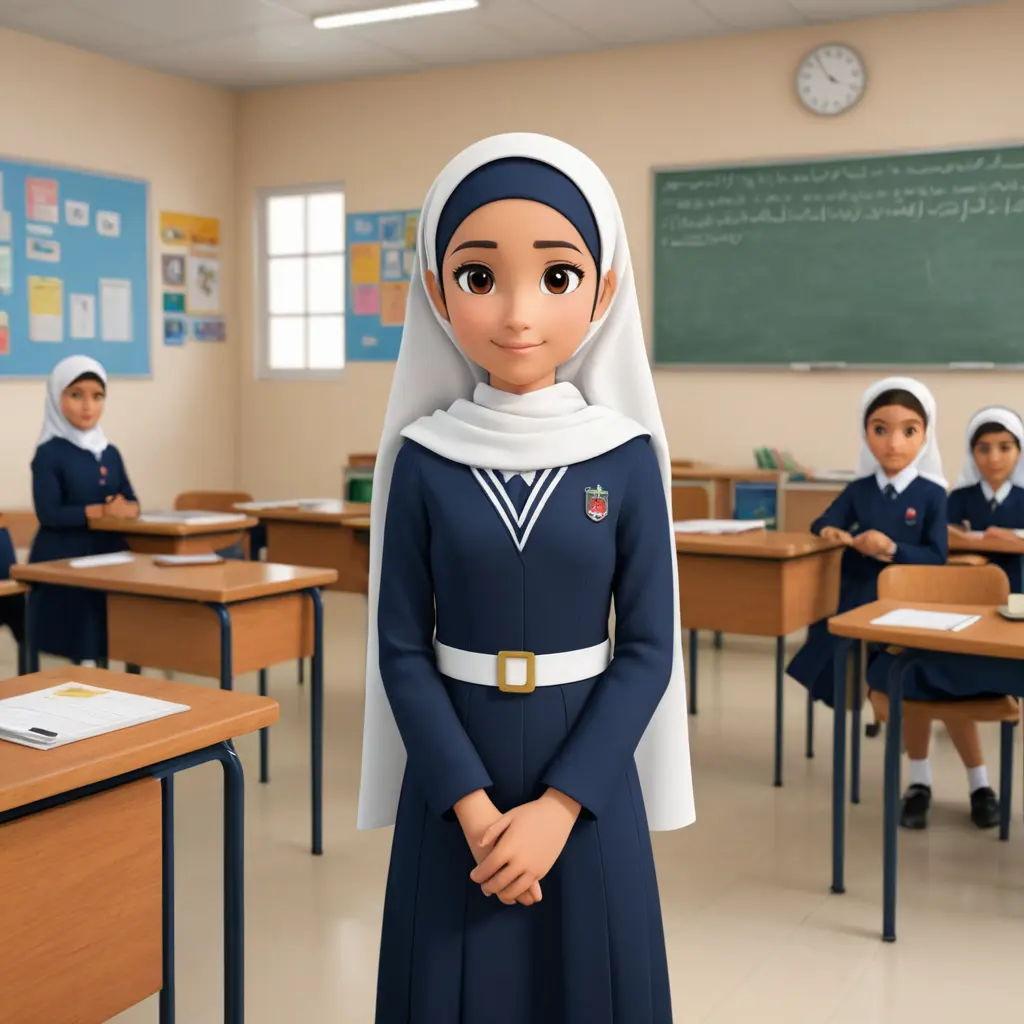 طالبة عمانية شخصية كرتونية ثري دي ترتدي حجاب أبيض وزي مدرسي كحلي تقف في صفها