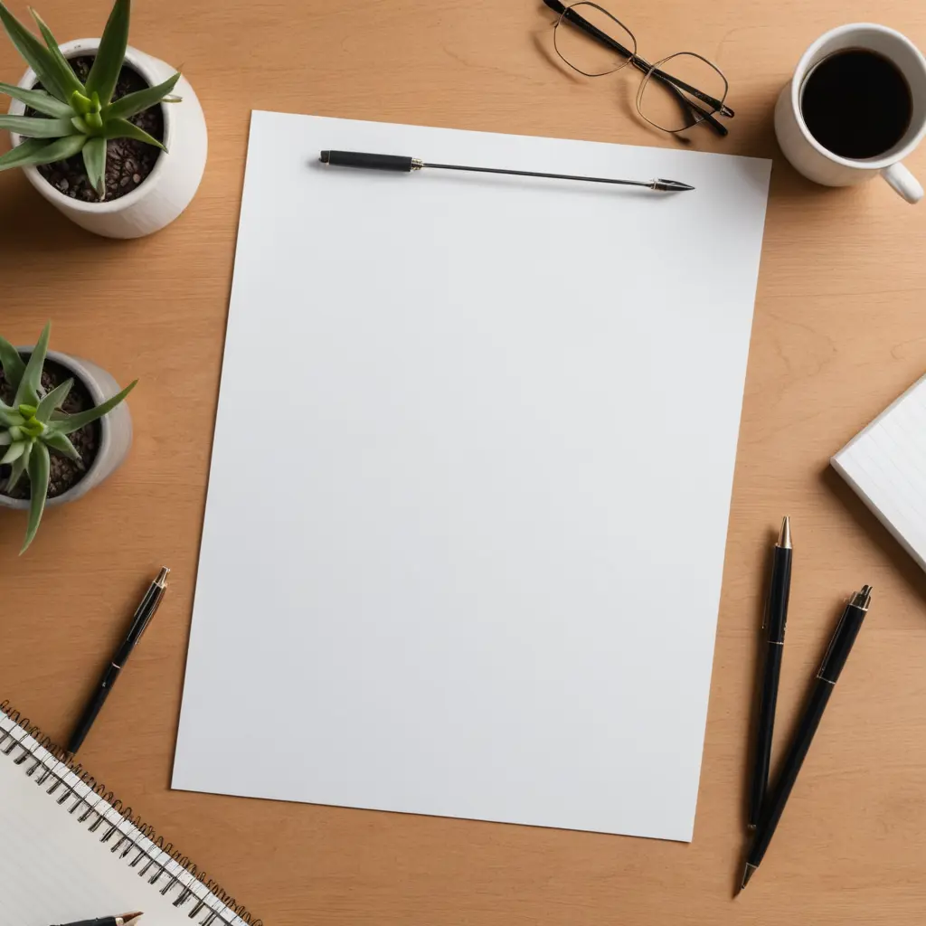 ورقة فارغة للكتابة عليها وحولها نظارة وأقلام على مكتب