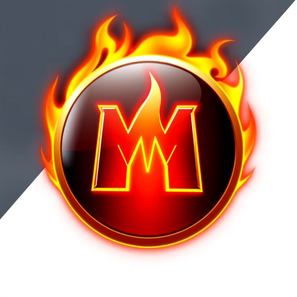 شعار ماركة بحرف m و s صغيرة لامع و منمق، يحترق، في امريكا بارد، مصنوع بألوان االاحمر الفاقع والاصفر الداكن، حاد، عصري حدا، مع لمسات الكترونية