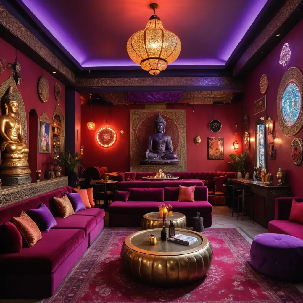 Bar restaurante ecléctico y bohemio, con muchos sofás de terciopelo de color morado y rojo intenso, pufs marroquíes,  mesas redondas y luces de neón y un gran Buda de estatua con un gran cartel que diga como logo Sab's Home. Que se vean diferentes salones distribuidos por el restaurante