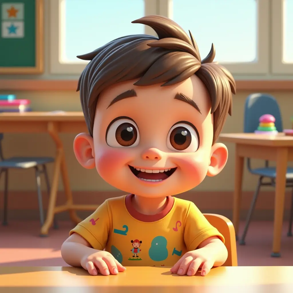 *Stylized 3D Anime-Style Illustration Prompt:** A adorable 3-year-old boy with big, bright eyes and short, soft hair, sitting at a classroom desk. He has a cheerful and curious expression, with a wide smile showing tiny teeth. He wears a colorful, playful outfit — a cute t-shirt with fun patterns and comfortable shorts or pants, along with small shoes. His posture is relaxed and playful, with his hands resting on the desk, looking around or engaging with classroom objects. The scene features a classroom background with a desk, books, and educational toys, rendered in vibrant 3D style with smooth shading, detailed textures, and a warm, inviting atmosphere. The overall style is cute, lively, and charming, highlighting the innocence and energy of a young boy in a stylized anime-inspired