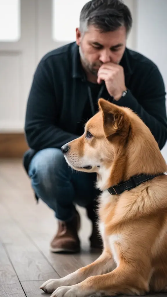 تصوير كلب يجلس بجوار صاحبه في لحظة حزينة. - *وصف الحركة:* الكلب يضع رأسه على ركبتي صاحبه، ينظر إليه بقلق.