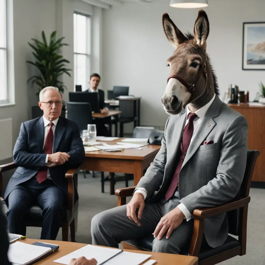 حمار يجلس في مكتب و يلبس لباس أنيق و يترأس إجتماع