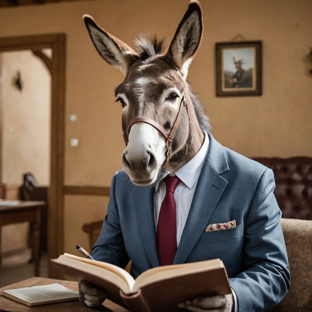 حمار مهموم يرتدي بدلة يقرأ كتاب