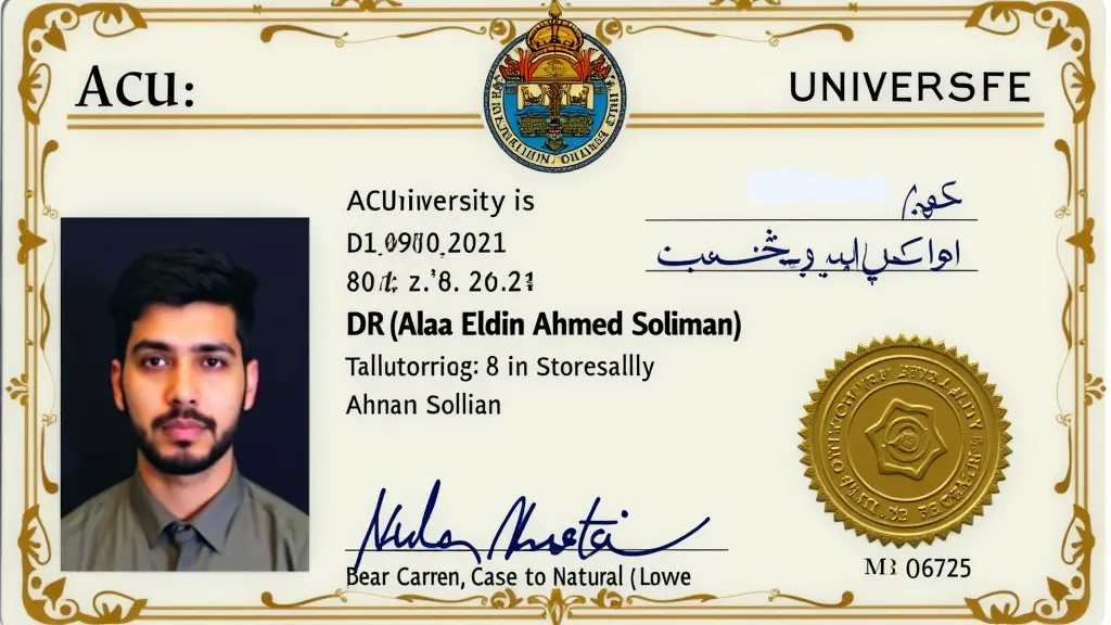 identity card of ACU university with name DR/Alaa Eldin Ahmed Soliman and has golden stamp with its logo