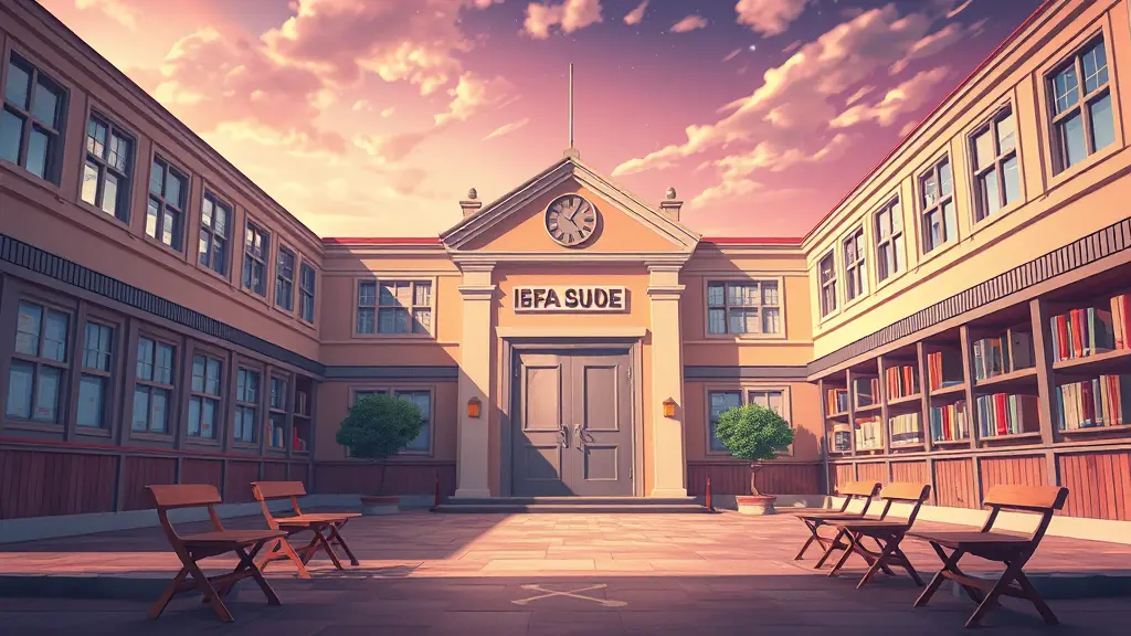 خلفية مدرسة ابتدائي الفضاء خارجي ساحة مدرسة تقابلها مكتبة قديمة الباب قديم اريدها كرتون رسوم متحركة مثل افلام هوليود جودة عالية 3d مع النهار