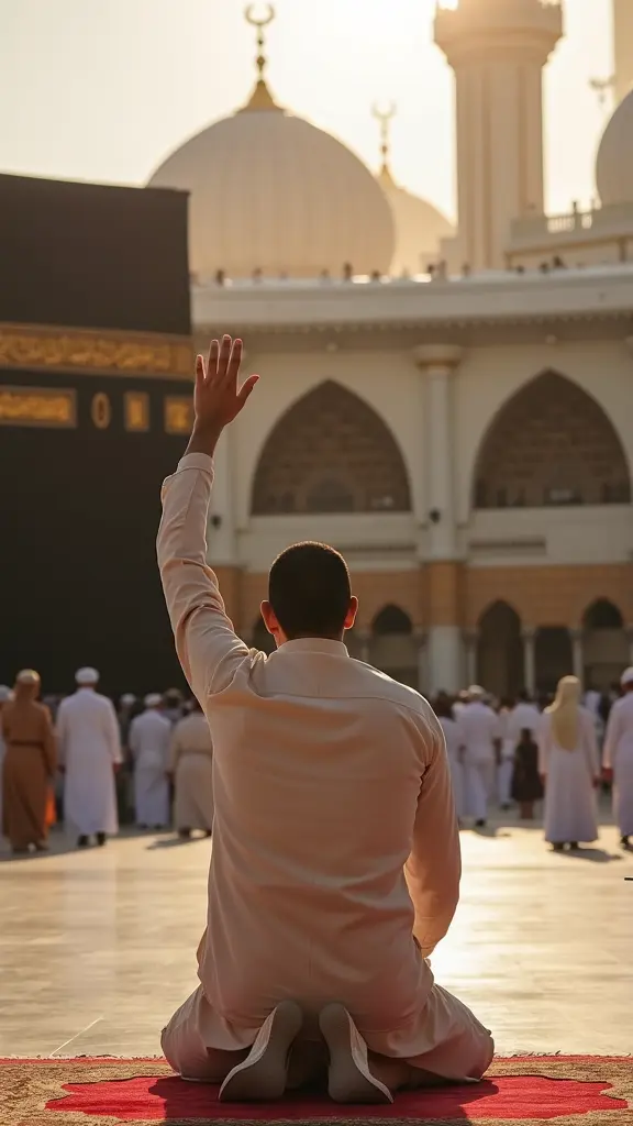 صورة رجل ساجد امام الكعبة ورافع يده الى سماء يدعو ربه