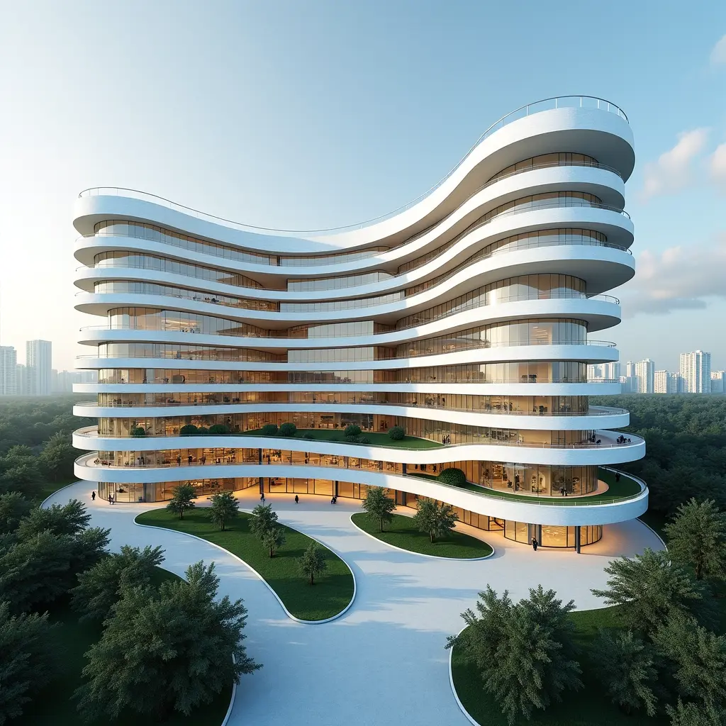The design of the general teaching hospital is inspired by the function of the heart, where the central core (the heart) represents the main section, including the intensive care unit and emergency department. The medical wings (arteries) branch out smoothly toward different departments, with fluid pathways resembling capillaries to ensure seamless movement. Flowing curves and transparent facades are used to reflect biological dynamism, along with internal courtyards and green spaces to enhance healing.