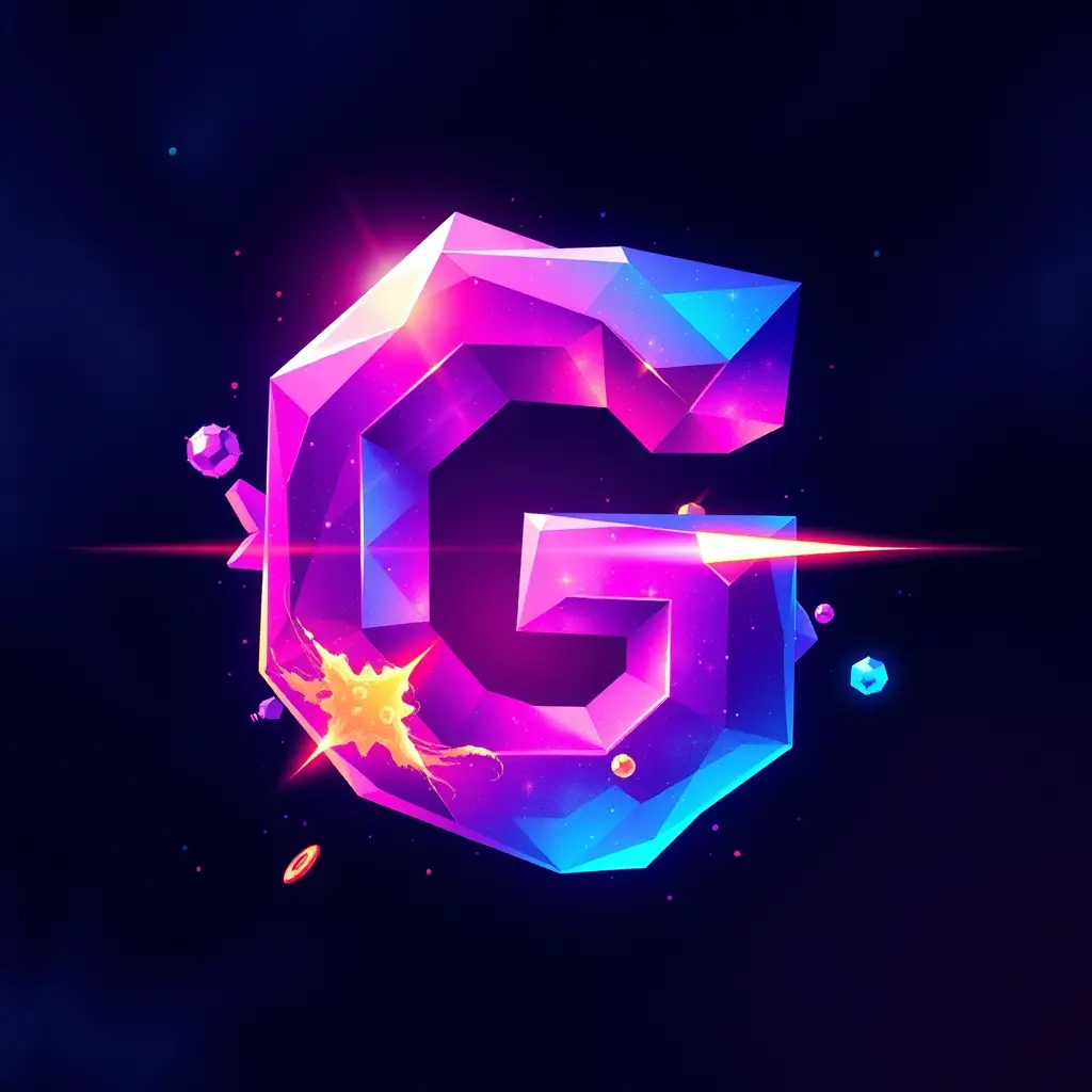 شعار جميل لشركة ألعاب، حرف G مع تأثيرات مجرة، بأسلوب فني حيوي يشبه ألعاب البكسل