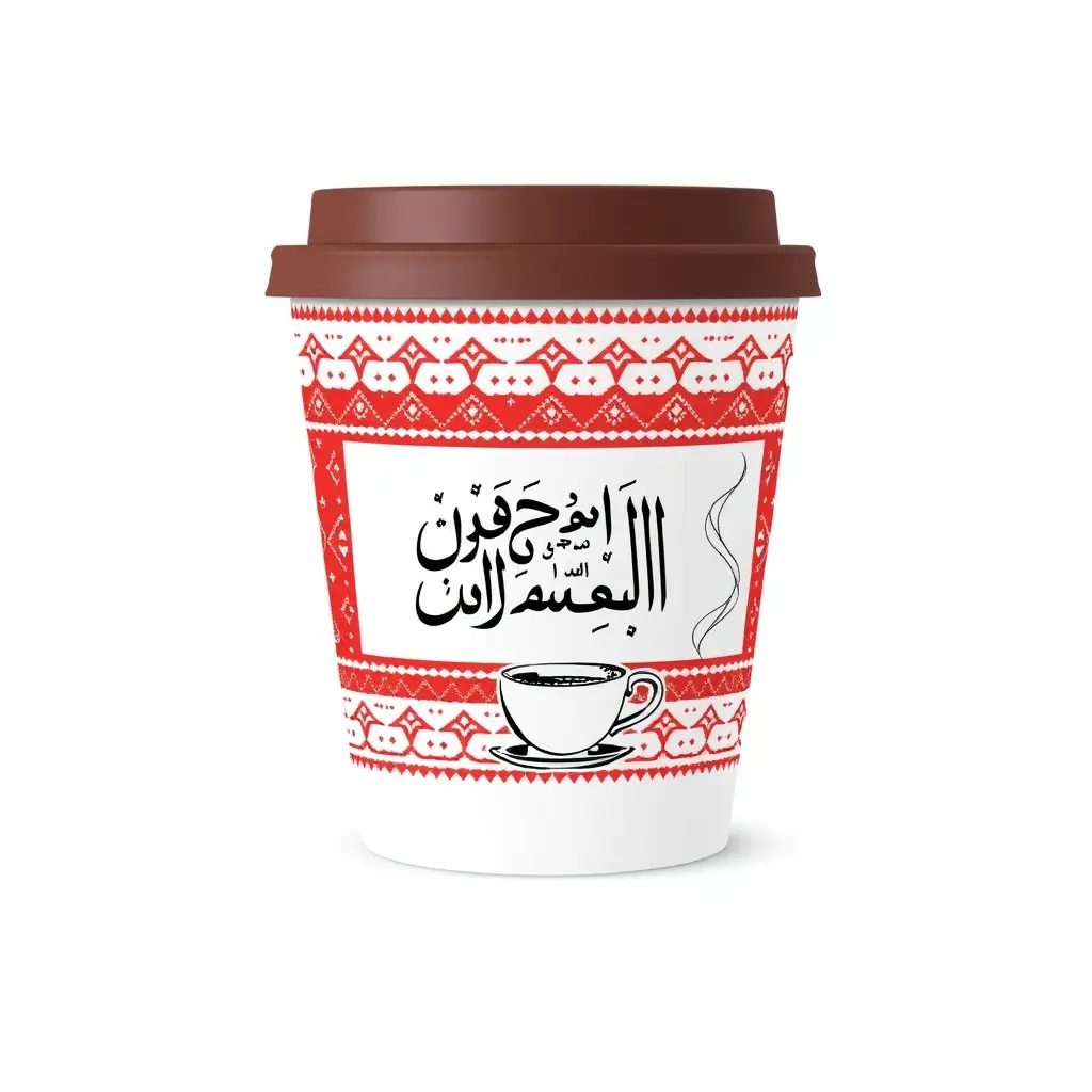 1- تصميم الشماغ الأحمر والخط العربي الوصف: تصميم يغطي الكوب بالكامل اجعلالتصميم بشكل مستطيل بنقشة الشماغ الأحمر التقليدي، مع إدخال خط عربي أنيق في المنتصف يحتوي على عبارة مثل "قهوتك بنكهة الأردن" أو "مزاج بدوي أصيل". يمكن استخدام اللون الأسود أو الأبيض للخط بحيث يكون واضحًا أمام تفاصيل الشماغ. يمكن إضافة رسمة صغيرة لفنجان قهوة بجانبه بخار يتصاعد بشكل زخرفي.