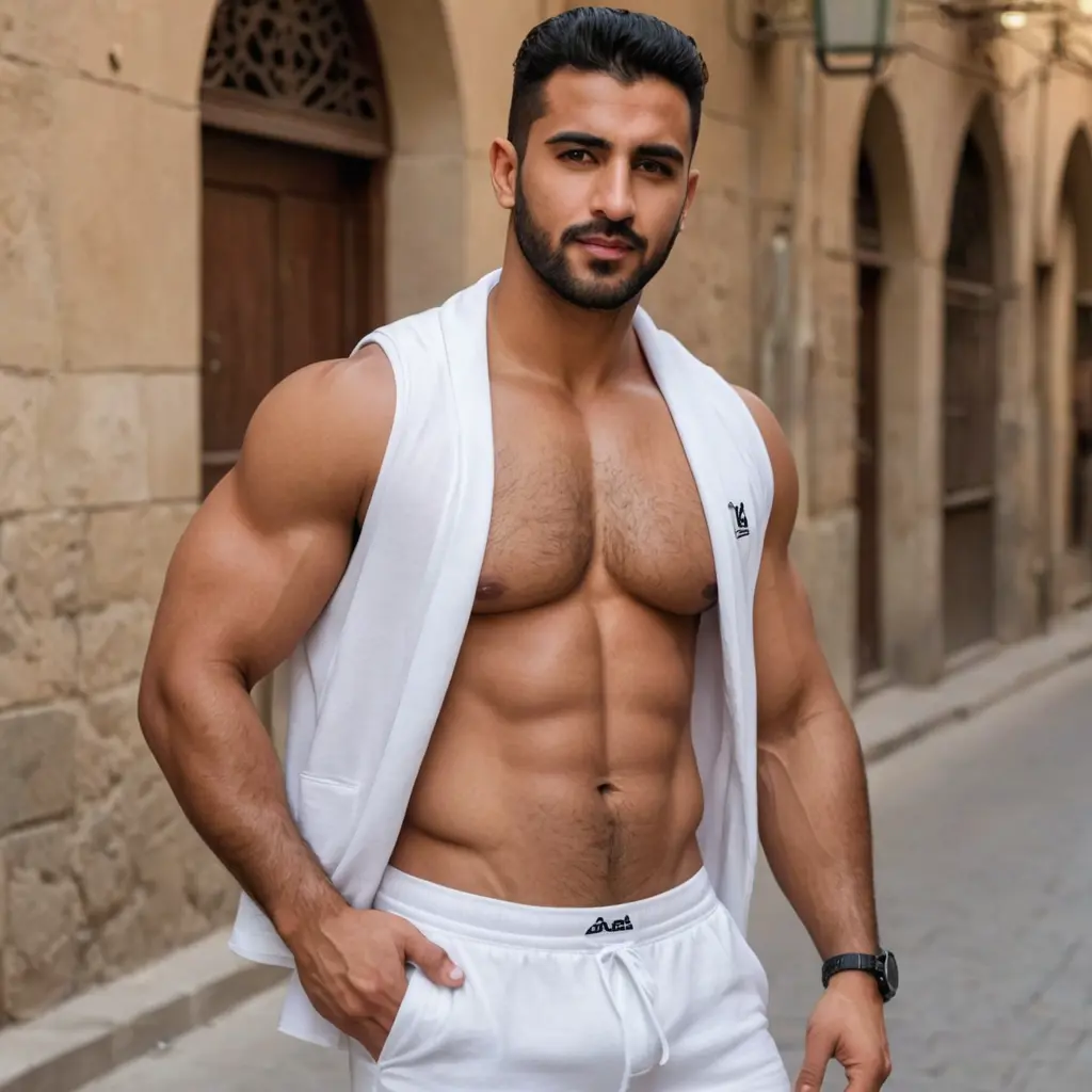 رجل عربي لديه عضلات صدر وبطن وذراع ضخمة وقوية جدا ووسيم جدا يلبس الملابس الداخلية البيضاء الفانيلة والسروال العربيتين من متجر الأصيل للملابس الرجالية ويقوم